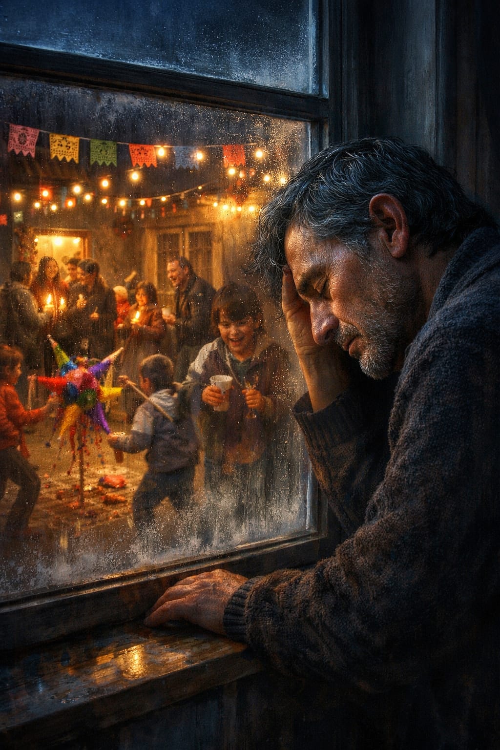 Las luces de colores parecían burlarse de él, desde el otro lado de la calle. Observaba, desde su ventana, a los vecinos reunidos en la posada del barrio. Se escuchaban villancicos desafinados, risas y luego el coro desafinado de quienes piden posada, finalmente los niños atizaron a golpes a la piñata, sonidos comparados con el golpeteo desesperado sobre una tabla de madera, como si su mente quisiera confundirlo, hacerle creer que alguien llegaría a tocar su puerta.