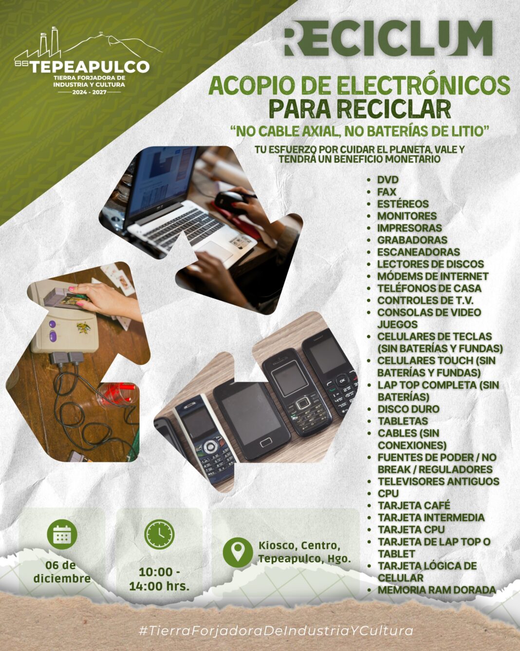 Tepeapulco, Hgo.- Con el objetivo de fomentar la conciencia ambiental y contribuir al desarrollo sostenible, el alcalde de Tepeapulco, Alfredo González Quiroz, a través del área de Medio Ambiente, invitó a la ciudadanía a participar en el “Reciclum, Acopio de Electrónicos para Reciclar”, que se llevará a cabo el próximo sábado, 06 de diciembre.