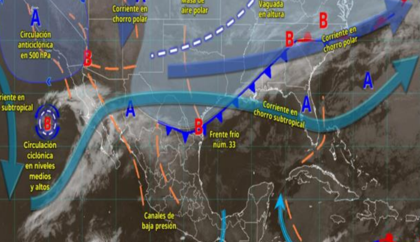 La Coordinación Nacional de Protección Civil (CNPC), de la Secretaría de Seguridad y Protección Ciudadana (SSPC), informó que derivado del Frente Frío Número 33, la masa de aire polar que lo impulsa ingresó sobre el norte de México e interacciona con la corriente en chorro subtropical, lo que comenzó a ocasionar un descenso de temperatura y vientos fuertes en dicha región.