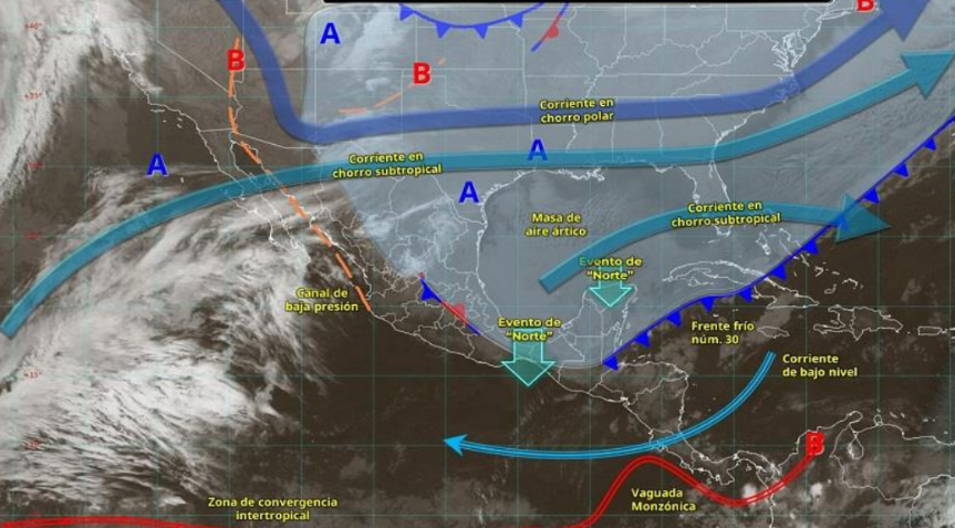 La dependencia señaló que la masa de aire ártico asociada al Frente Frío Número 30 provocará chubascos y lluvias fuertes a muy fuertes en el oriente y sureste del país. Simultáneamente, persistirá el evento de «Norte» con intensidad crítica con rachas de viento de 90 a 110 kilómetros por hora en el Istmo y Golfo de Tehuantepec, así como de 50 a 70 kilómetros por hora en Veracruz y Quintana Roo. Mientras tanto, en la Mesa del Norte y la Mesa Central, incluido el Valle de México, prevalecerá un ambiente de muy frío a gélido con densos bancos de niebla matutinos.