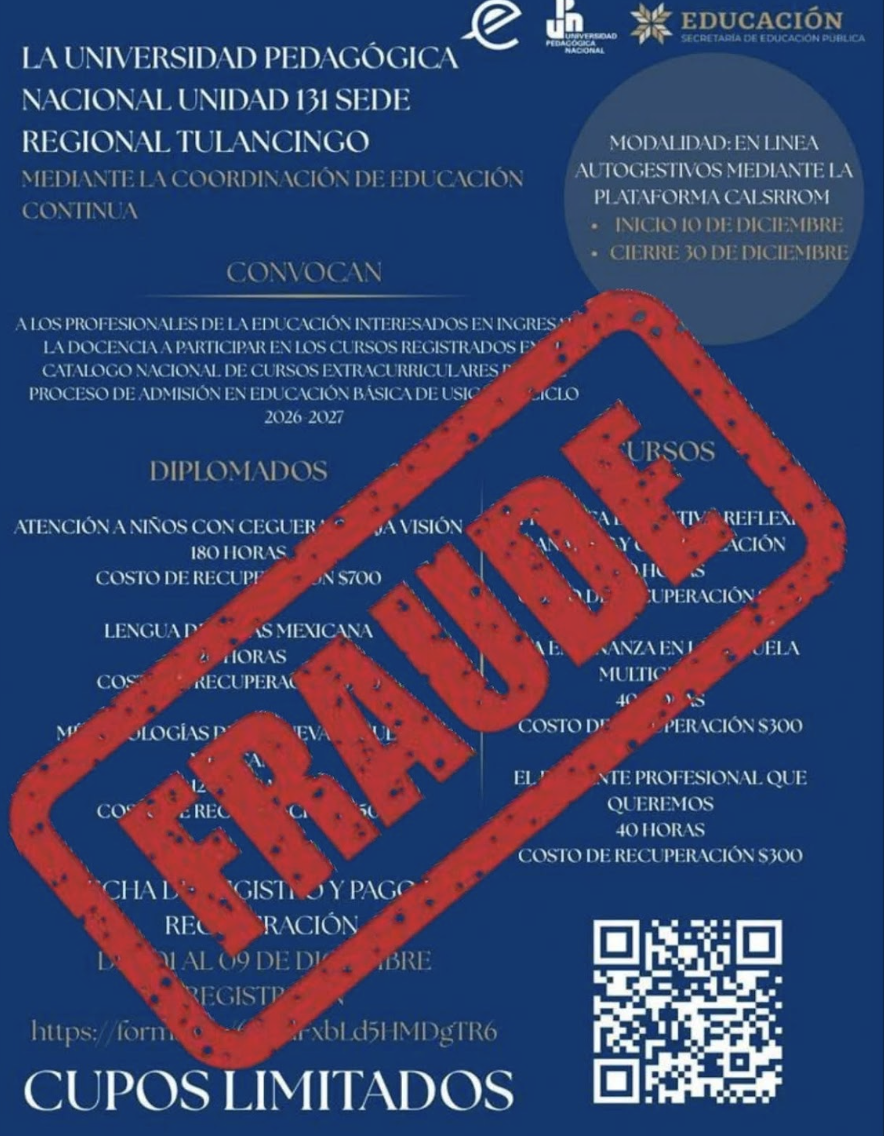 Lo anterior a raíz de una publicación no oficial que circula en redes sociales, la cual anuncia cursos y diplomados con el nombre de la UPN-H y sellos de la Secretaría de Educación Pública (SEP), por lo que fue calificada como un fraude.
