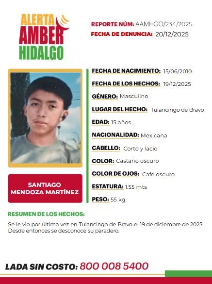 Cuenta con 15 años de edad, tiene el cabello corto y lacio, color castaño oscuro, color de ojos café oscuro, estatura de 1.55 metros, y refiere que se le vio por última vez en Tulancingo de Bravo, el 19 de diciembre de este año, y desde entonces se desconoce su paradero.
