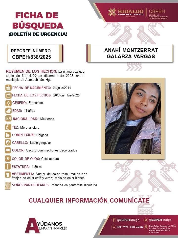 Una de las fichas de búsqueda, con el reporte CBPEH/838/2025, es en favor de Anahí Montzerrat Galarza Vargas, de 14 años de edad, a quien se le vio por última vez el pasado 20 de diciembre en el municipio de Acaxochitlán.
