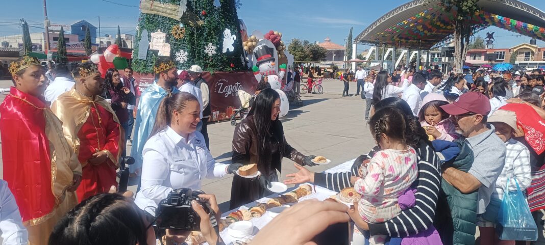 Emiliano Zapata, Hgo.- Dentro del marco del “Día de Reyes”, la alcaldesa Nelyda Hernández Palomares, partió la tradicional “Rosca de Reyes” acompañada por más de 500 niños y niñas de la cabecera municipal, quienes disfrutaron de un momento agradable.