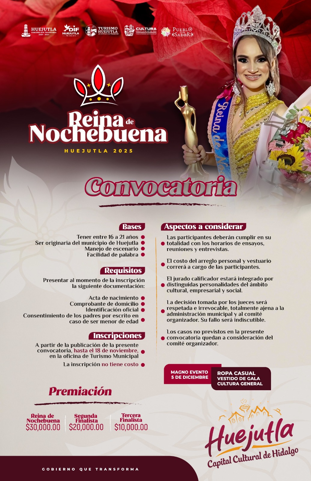 Huejutla, Hidalgo, 11 de noviembre de 2025.- El Gobierno Municipal de Huejutla, encabezado por el Lic. José Alfredo San Román Duval, a través de la Dirección de Turismo y en coordinación con el área de Cultura y el DIF Municipal, emitió la convocatoria dirigida a las jóvenes huejutlenses de entre 16 y 21 años de edad para participar en el Certamen Reina de Nochebuena 2025, que se celebrará el próximo 5 de diciembre.