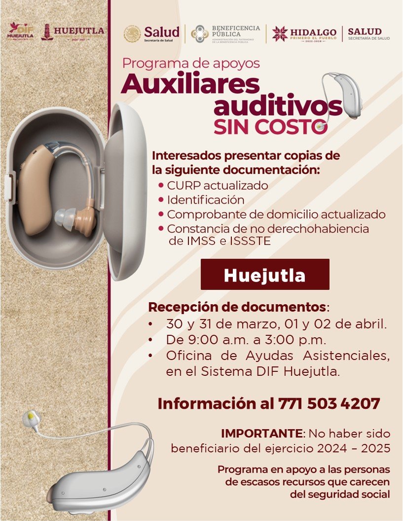 Huejutla de Reyes, Hidalgo.- El Sistema DIF Municipal de Huejutla, en coordinación con la Secretaría de Salud, la Beneficencia Pública, el Gobierno de Hidalgo y el Gobierno Municipal de Huejutla de Reyes, abre el registro para el Programa de Apoyo de Auxiliares Auditivos Sin Costo, dirigido a personas con discapacidad auditiva.