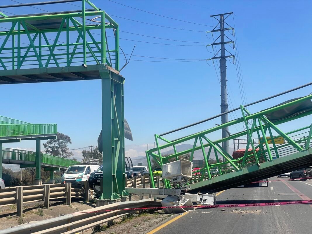 El derribo del puente fue producto de una colisión de un camión pluma, que al parecer tenía levantada la estructura con la cual impactó y desplazó el puente peatonal, debido a que estaba simplemente apoyado, moviendo una solera que tenía de soporte.