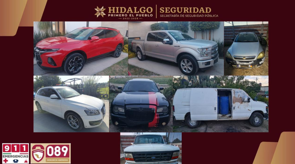 La Secretaría de Seguridad Pública de Hidalgo (SSPH) realizó un operativo en la colonia Francisco Villa, Cuautepec de Hinojosa. Las acciones resultaron en el aseguramiento de dos hombres, 120 autopartes, 758 dosis de sustancias con características de narcóticos y siete vehículos, algunos con reporte de robo e irregularidades, al intervenir cuatro inmuebles.