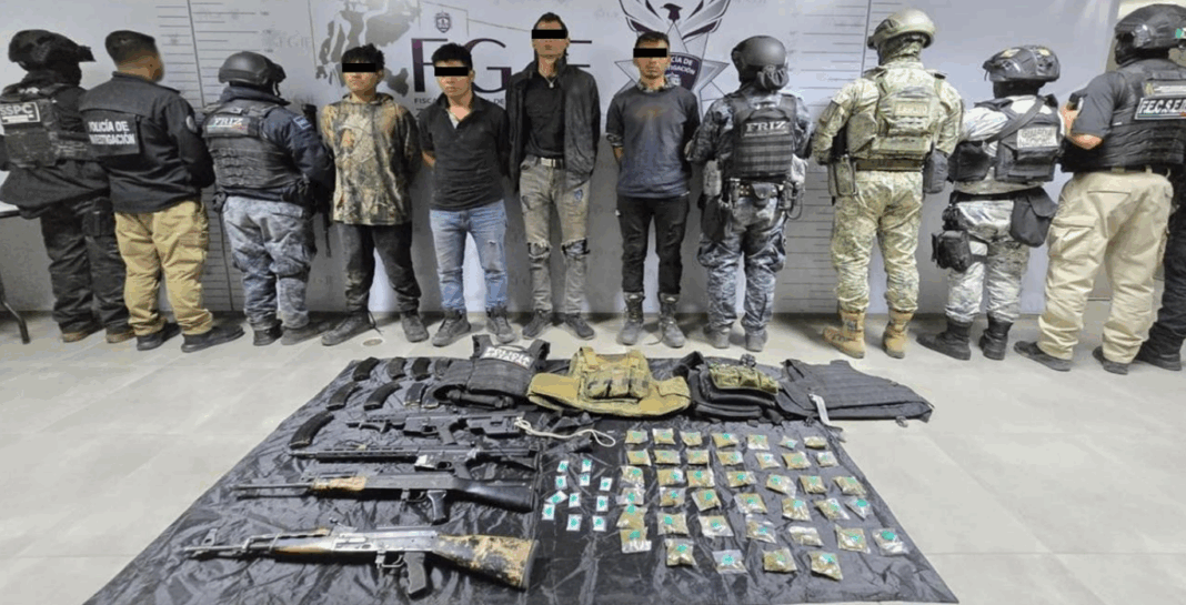 Finalmente en Villanueva, Zacatecas, elementos del Ejército Mexicano, Fiscalía y Policía Estatal arrestaron a cuatro personas, confiscaron cuatro armas largas, cargadores, 200 cartuchos, diversas dosis de droga y cuatro chalecos tácticos.