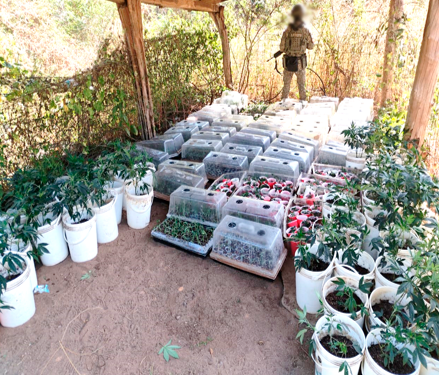 En Elota, localizaron cuatro campamentos clandestinos, resguardaron cuatro armas largas, 57 cargadores, dos mil 944 cartuchos y cuatro chalecos tácticos. Además, fueron incineradas tres mil 196 plantas de marihuana. En Navolato, en la avenida Macario Gaxiola, al realizar recorridos de seguridad y vigilancia aprehendieron a dos personas, incautaron armas de fuego y un vehículo.