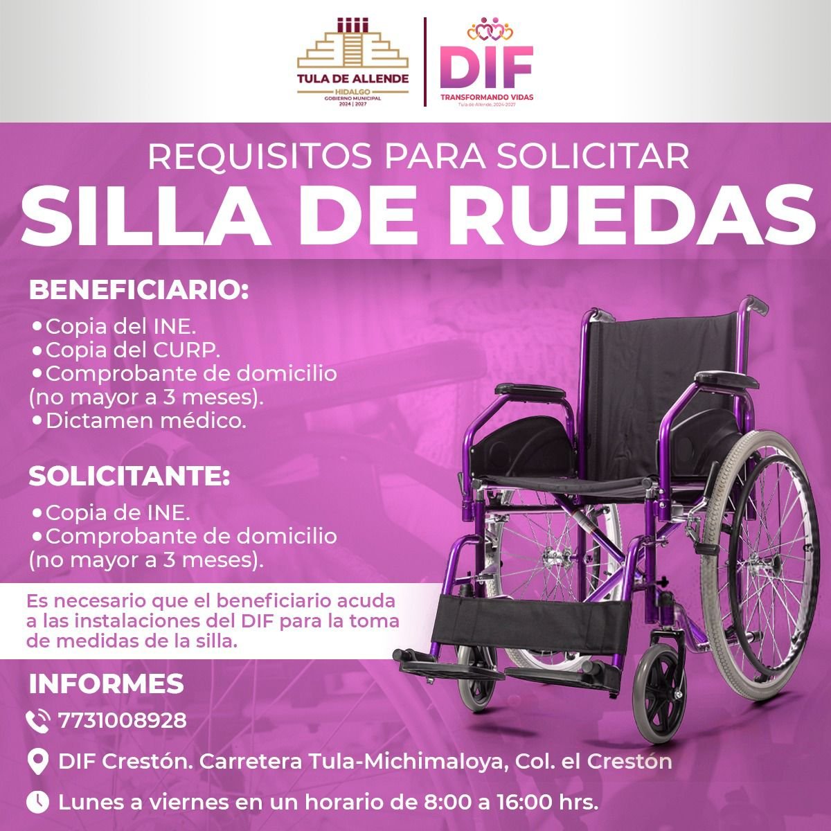 Las y los interesados pueden comunicarse al teléfono 773 100 8928, enviar mensaje a través de las redes sociales oficiales del SMDIF Tula o acudir directamente a las instalaciones del Sistema Municipal DIF.