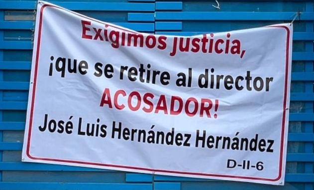 Las consignas colocadas alrededor de la institución citan “Exigimos justicia, que se retire al director acosador”, “Exigimos que se respeten las instalaciones educativas y no se renten como estacionamiento ni para cultos religioso”, “Exigimos que se sancione a los aviadores”.