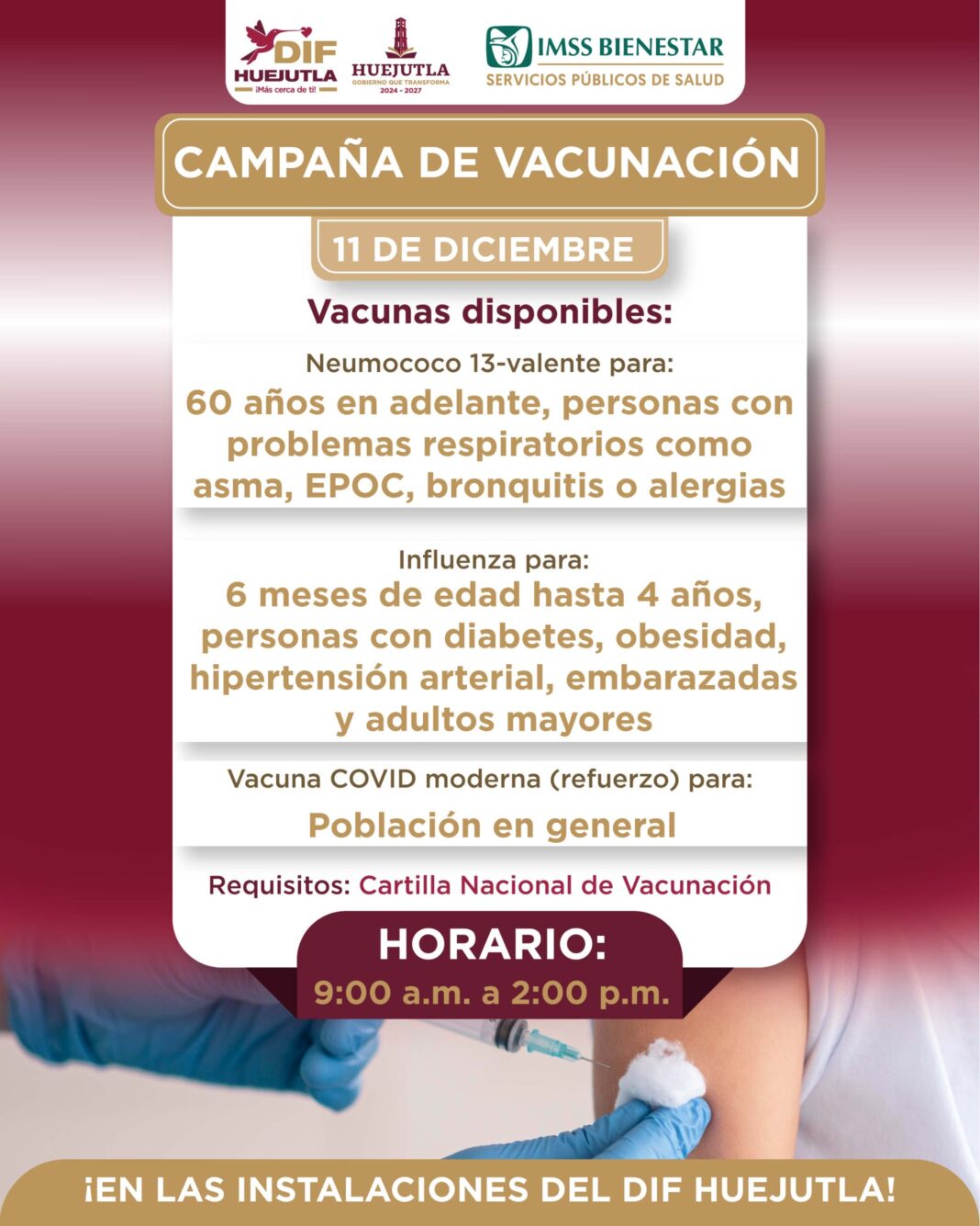 Huejutla.- Ante el inicio de la temporada invernal, el Gobierno Municipal y el Sistema DIF Huejutla, en coordinación con IMSS Bienestar, invitan a la población a participar en la Jornada de Vacunación que se llevará a cabo el día de hoy, jueves 11 de diciembre en sus instalaciones, de 09:00 a 14:00 horas.