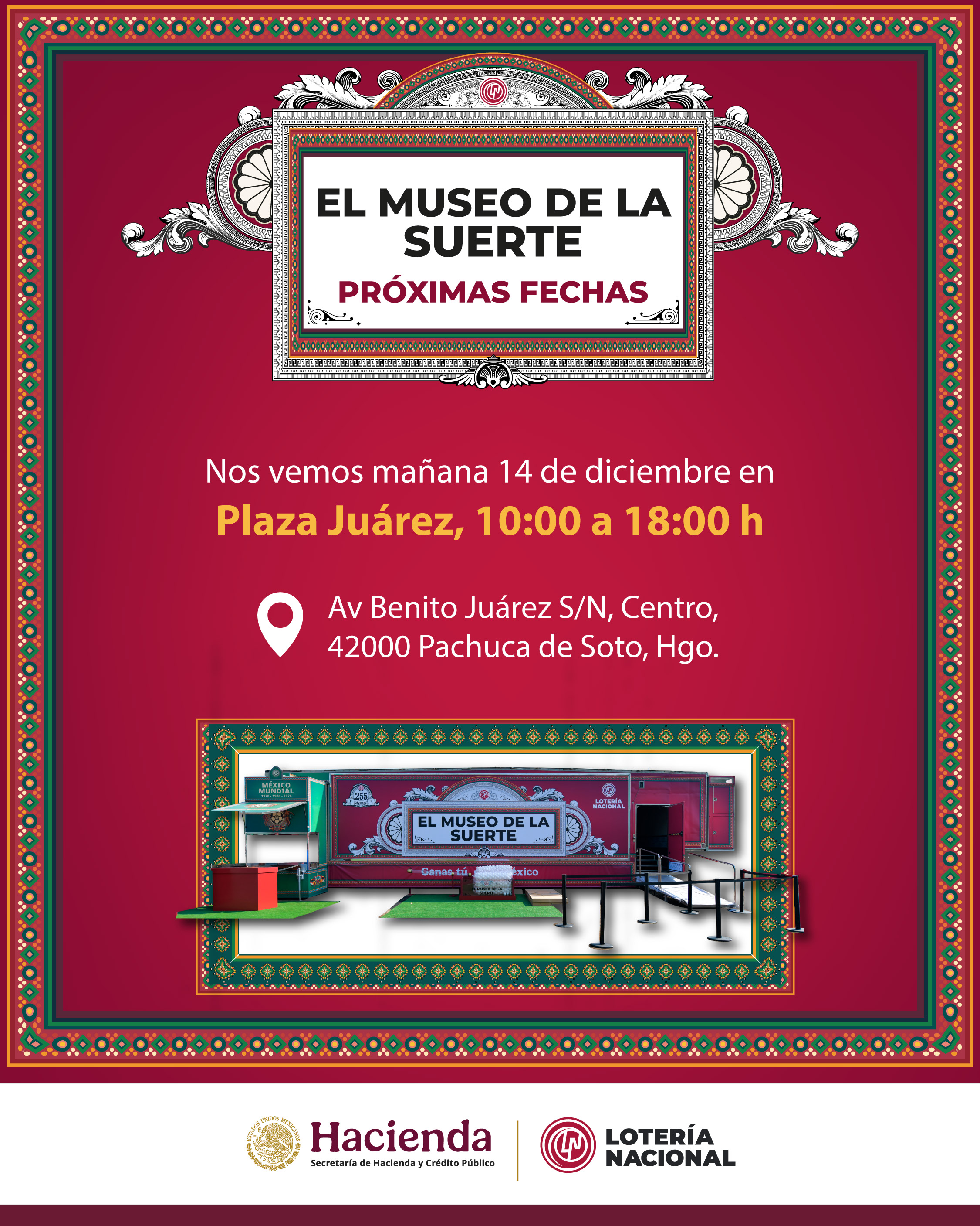 Como parte de su gira, el Museo de la Suerte de Lotería Nacional hará escala este domingo 14 de diciembre en Pachuca, donde las y los visitantes podrán conocer de manera gratuita la historia y el legado de una de las instituciones con mayor tradición en el país.