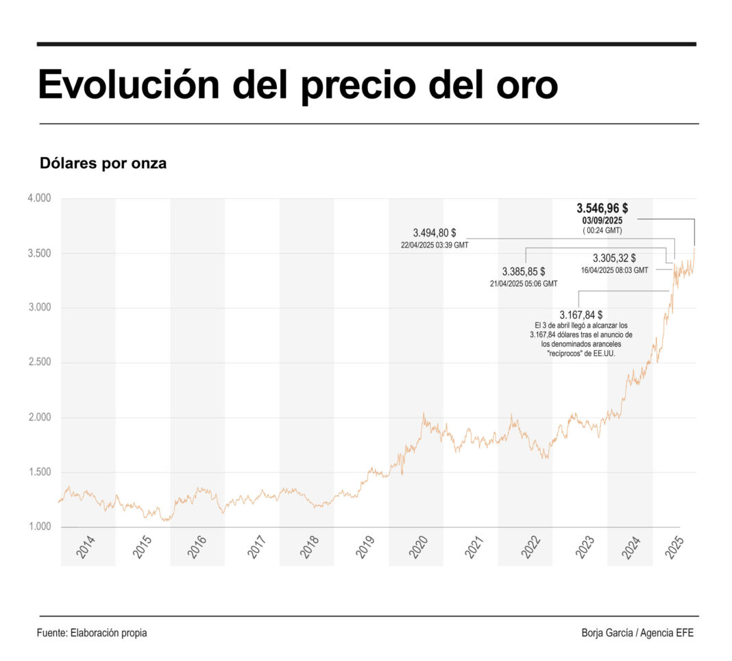 Esta madrugada el oro alcanzó los 3 mil 546,96 dólares y a lo largo de este miércoles ha ido revalidando sus cifras récord, al igual que lo hizo en la víspera, cuando superó su último máximo, alcanzado el pasado abril, en los 3 mil 500,10 dólares por onza.