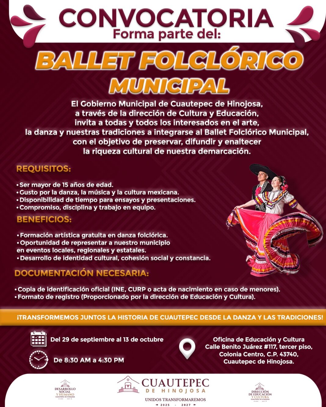 Cuautepec de Hinojosa, Hgo.- El gobierno municipal de Cuautepec de Hinojosa, a través de la dirección de Cultura y Educación, emitió la convocatoria que llama a las y los interesados en el arte, la danza y las tradiciones mexicanas a formar parte del Ballet Folclórico Municipal, con el objetivo de preservar, difundir y enaltecer la riqueza cultural de la demarcación.