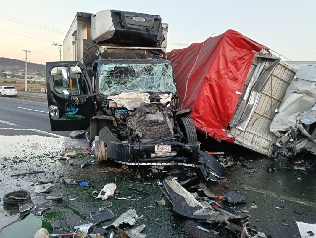Se refiere que el camión de carga presentó una falla mecánica que provocó la salida de una de sus ruedas, por lo que invadió el carril contrario e impactó a la otra pesada unidad; ambos vehículos quedaron prácticamente con las cabinas destrozadas.