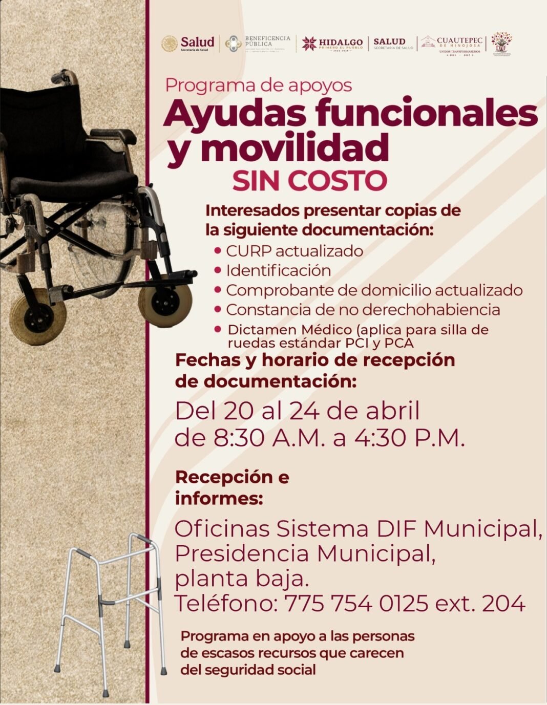 Las y los interesados deberán presentar CURP actualizado, identificación oficial, comprobante de domicilio reciente, constancia de no derechohabiencia y, en caso de requerir silla de ruedas estándar (PCI o PCA), además de su dictamen médico del 20 al 24 de abril, en un horario de 8:30 de la mañana a 4:30 de la tarde, en las oficinas del Sistema DIF local, ubicadas en la planta baja de la Presidencia Municipal.