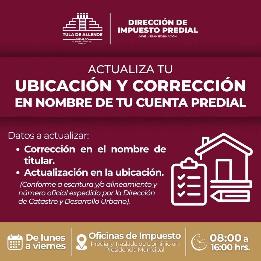El gobierno de Tula de Allende, invita a la población a actualizar la ubicación y corregir el nombre de su cuenta predial o, en su caso, asegurarse de que los datos de identidad sean los correctos.  Mediante un comunicado, la presidencia municipal informó: “acude a la dirección de impuesto predial y realiza tu actualización hoy mismo.  ¡Es rápido, sencillo y en beneficio de tu patrimonio! El horario es de 08:00 a 16:00 horas, de lunes a viernes en la Oficinas de Impuesto (en la Presidencia Municipal).
