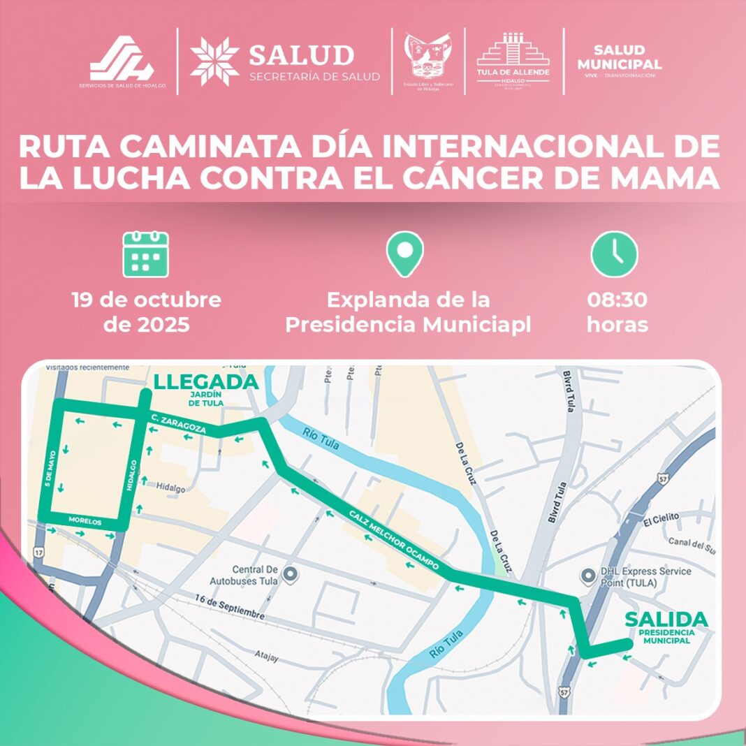 El gobierno municipal de Tula de Allende, a través de la Secretaría de Salud de Hidalgo, invita a la ciudadanía a participar en la caminata conmemorativa del Día Mundial de la Lucha contra el Cáncer de Mama.