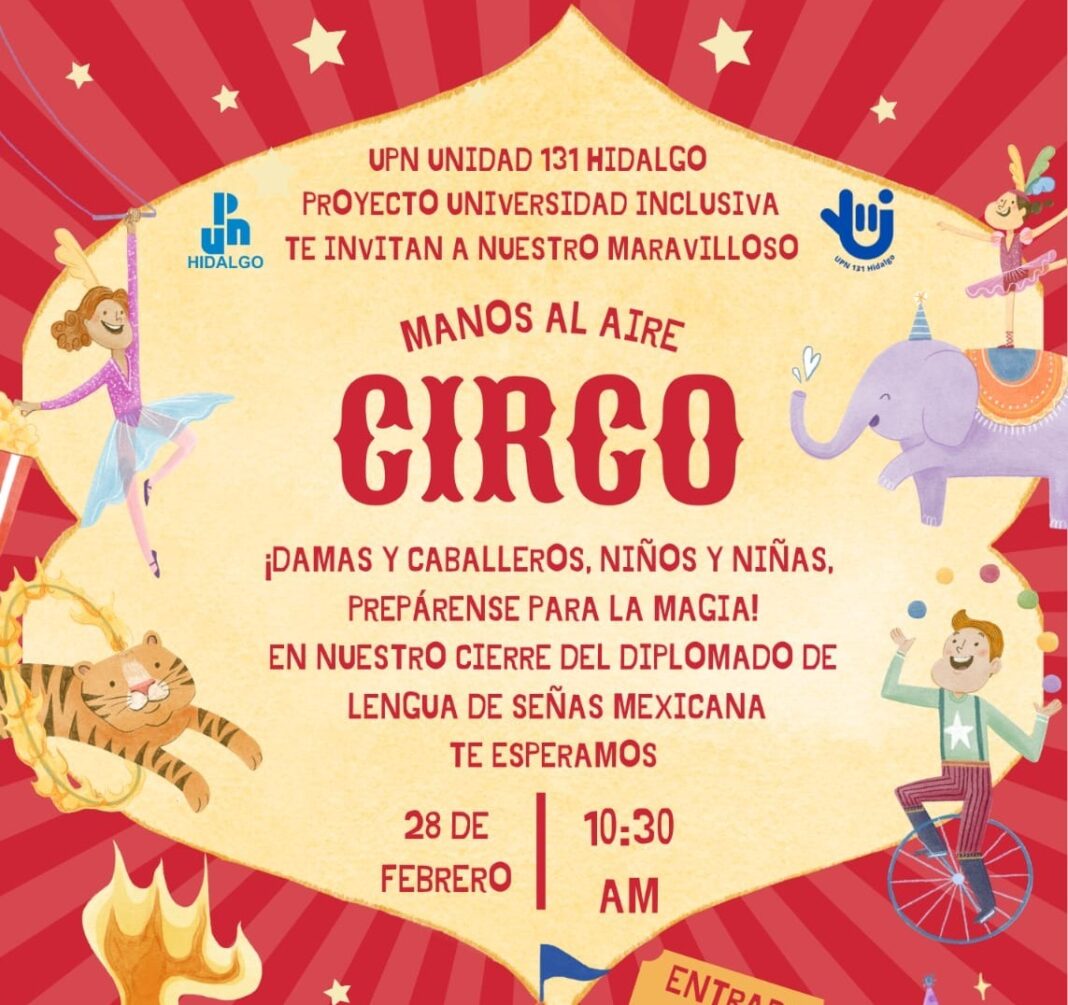 La Unidad 131 Hidalgo de la Universidad Pedagógica Nacional (UPN-H) emitió una invitación al público en general para que el próximo 28 de febrero acudan a la presentación del espectáculo de circo que se realizará en el marco de la conclusión del Diplomado en Lengua de Señas Mexicana.