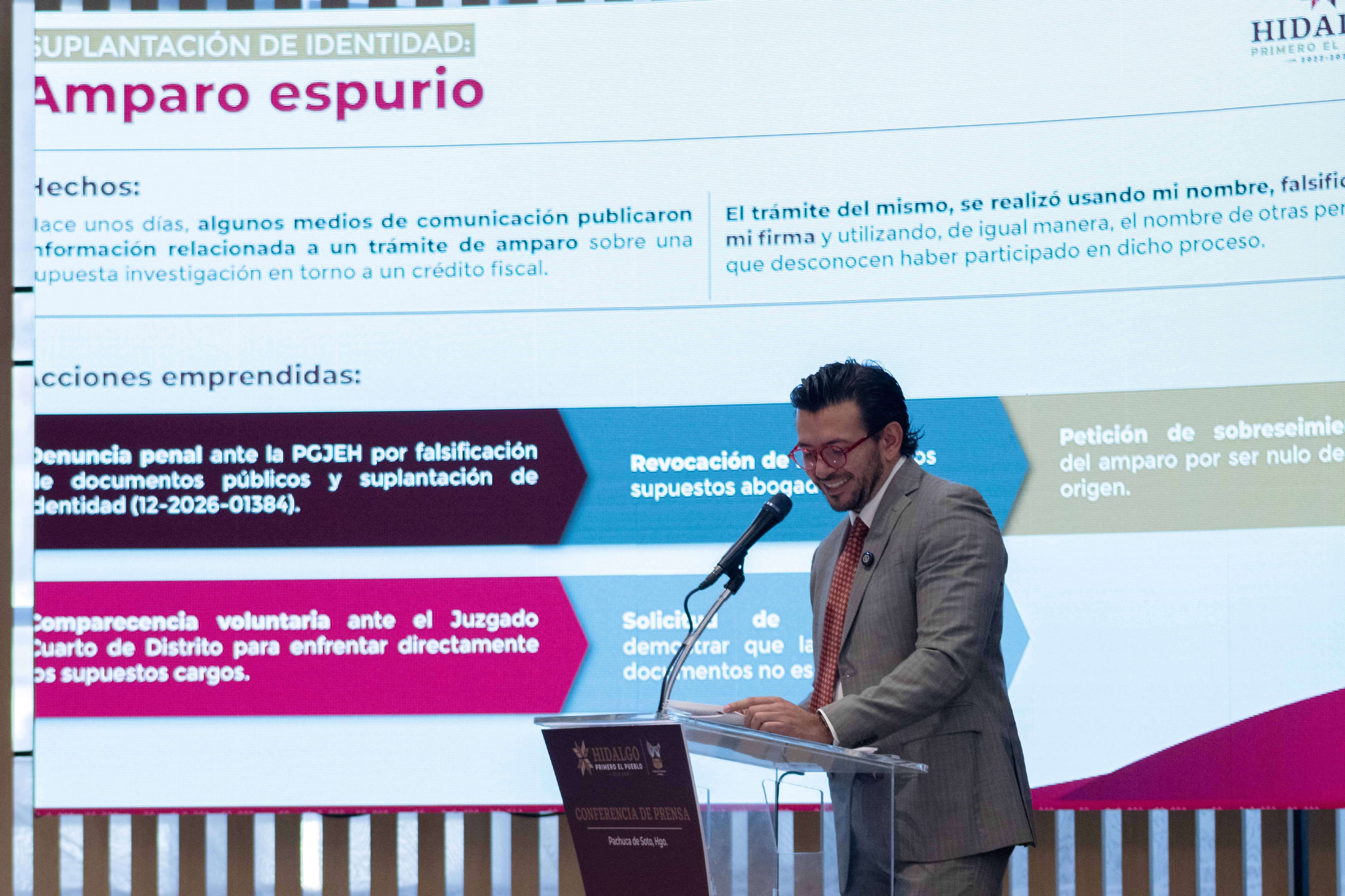 De manera paralela, informó que presentó una denuncia formal ante la Procuraduría General de Justicia del Estado de Hidalgo (PGJEH) por los delitos de usurpación de identidad, falsificación de documentos, uso de documentos falsos y fraude procesal.