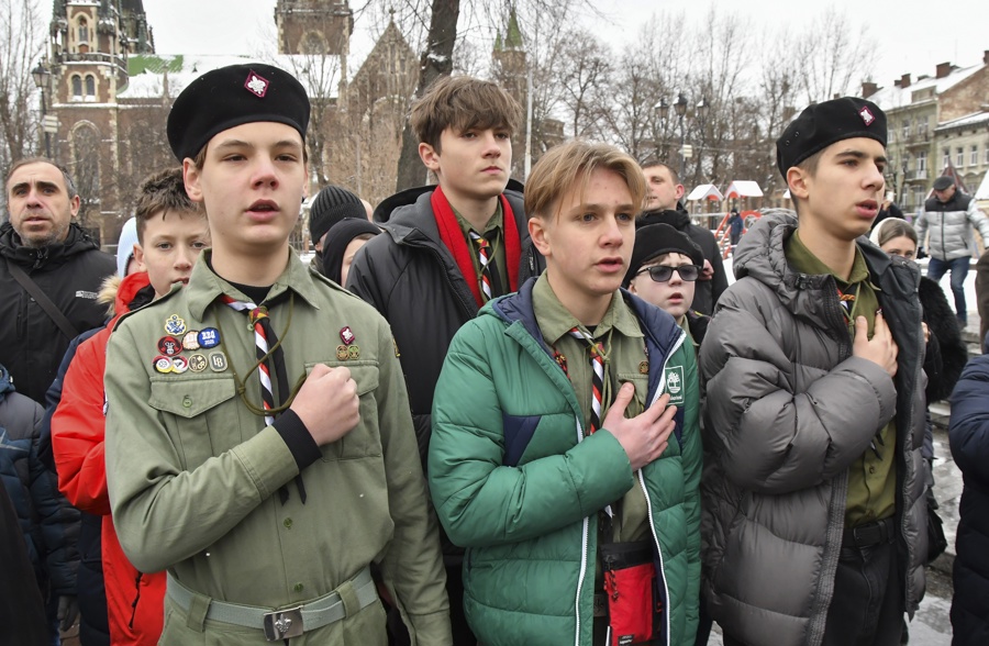 Una nevada ofreció un atisbo de un ambiente festivo a los ucranianos que celebraron Año Nuevo en la ciudad occidental ucraniana de Leópolis, donde un hombre en la veintena, con prótesis en lugar de ambas piernas y una gorra de estilo militar, permanecía silencioso al observar a su pareja dibujar un corazón en la nieve con una de sus muletas.