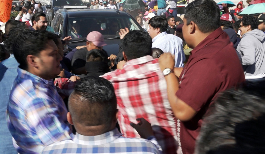 Los maestros respondieron también con empujones pero finalmente la camioneta presidencial logró vencer el cerco de la CNTE y retirarse del lugar.