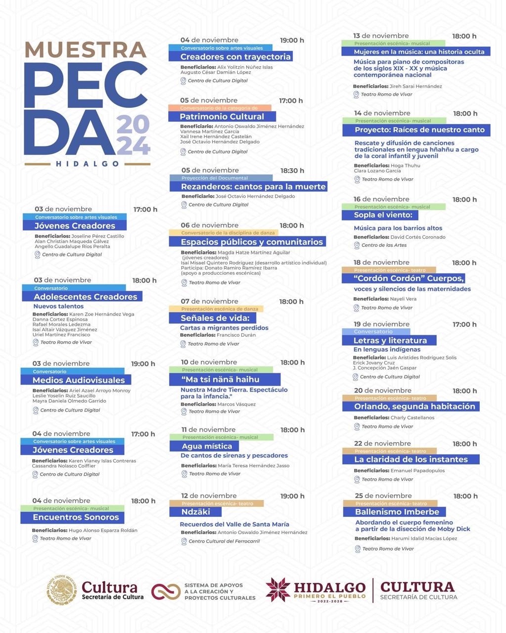 La Secretaría de Cultura del Estado de Hidalgo anuncia la realización de la Muestra PECDA Hidalgo 2024, que se llevará a cabo del 3 al 25 de noviembre, con una programación compuesta por 21 actividades públicas y gratuitas.
