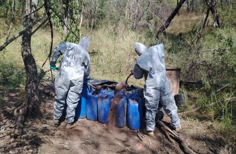 En Culiacán y Navolato, localizaron e inhabilitaron nueve áreas de concentración de material diverso para la fabricación de drogas sintéticas, confiscaron nueve mil 639 litros y 150 kilogramos de sustancias para la elaboración de metanfetamina, y una centrifugadora. La afectación económica a la delincuencia organizada es de 197 millones de pesos.