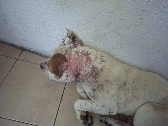 Durante la revisión clínica, el equipo veterinario constató que el canino presentaba dermatitis severa, además de haber sido expuesto aparentemente a algún tipo de ungüento o sustancia inadecuada, lo que agravó su condición y provocó el desprendimiento total del pelaje en zonas como orejas y cuello.