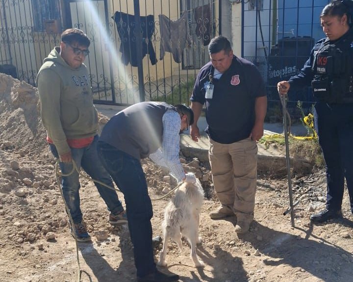 Un perro fue rescatado por elementos de la Dirección Canina K9 de una excavación correspondiente a las obras del drenaje pluvial en el fraccionamiento Campestre Villas del Álamo, tras haber caído en ella.