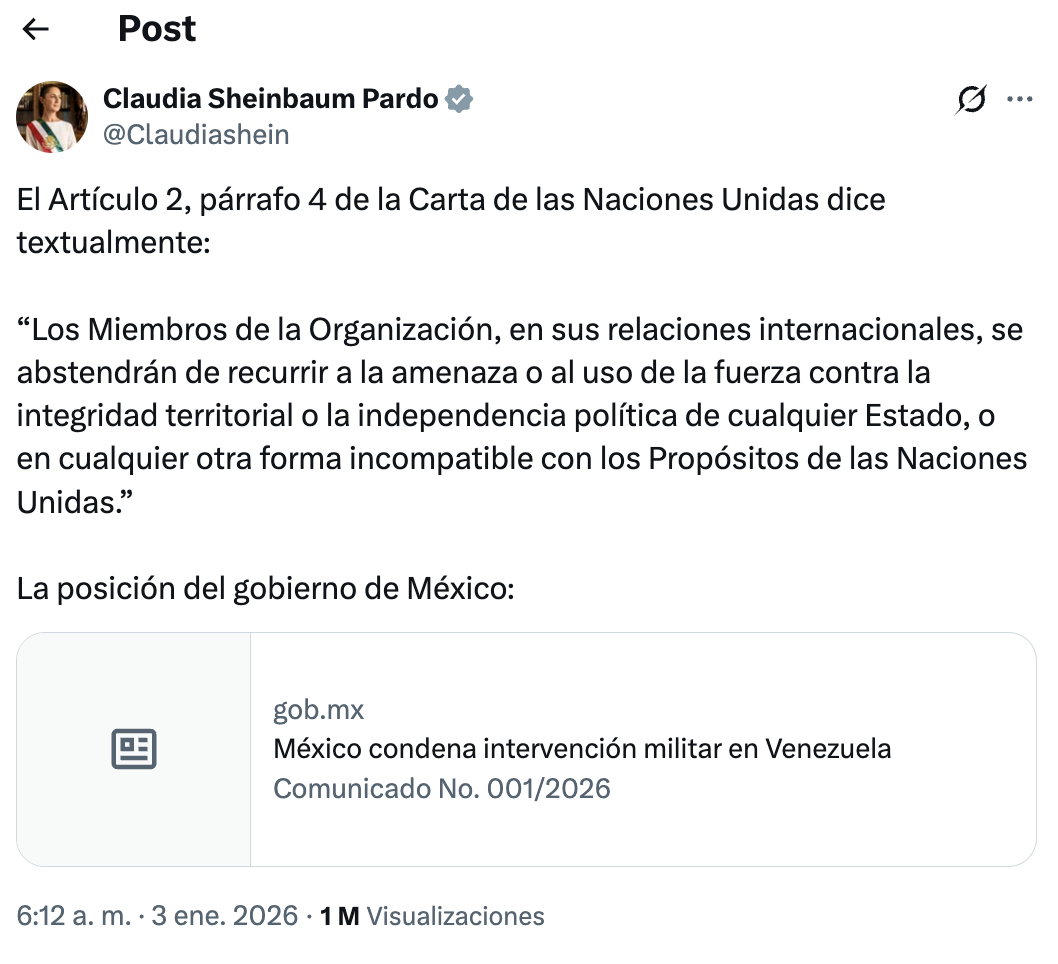 A través de un comunicado el gobierno de México que encabeza la presidenta Claudia Sheinbaum Pardo condenó y rechazó enérgicamente las acciones militares ejecutadas unilateralmente en las últimas horas por fuerzas armadas de los Estados Unidos en Venezuela, lo anterior, “en clara violación del artículo 2 de la Carta de la Organización de las Naciones Unidas (ONU)”.