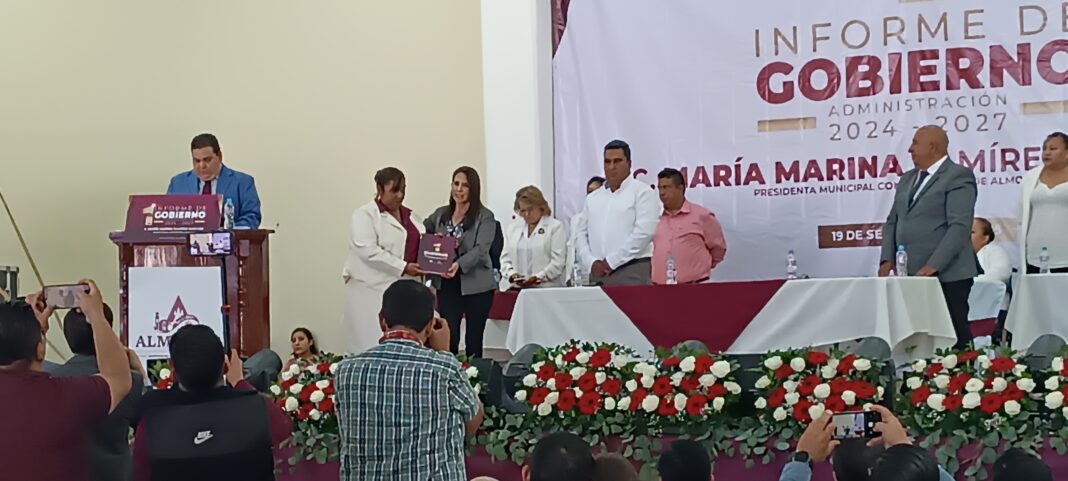 Almoloya, Hgo.- “Reafirmo mi compromiso de seguir trabajando de la mano con la población, para seguir cumpliendo con los compromisos que tengo con la sociedad”, señaló la alcaldesa María Marina Ramírez Sánchez, al rendir su primer informe de gobierno.