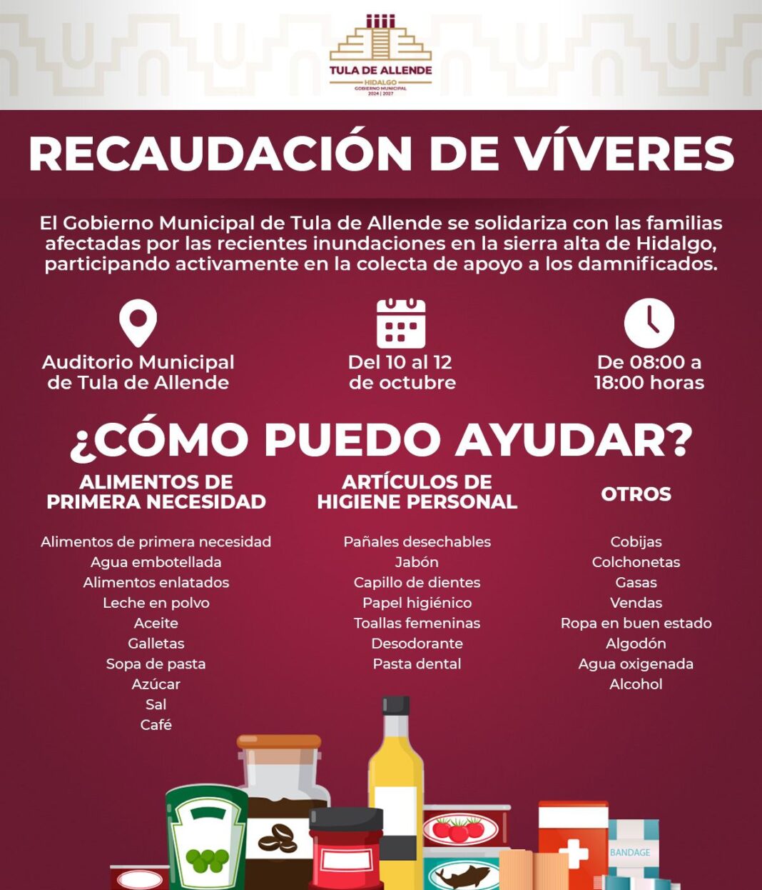 El Gobierno Municipal de Tula de Allende habilita un centro de acopio para recolectar víveres y artículos de primera necesidad.
