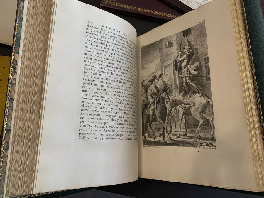 Asimismo, entre los tesoros que saldrán a subasta destaca un «Quijote» impreso en Madrid en 1780 por Joaquín Ibarra en una edición de cuatro volúmenes, considerada una de las más bellas de la historia del libro español, que incluye frontispicios, grabados, un mapa plegado y treinta y una láminas.
