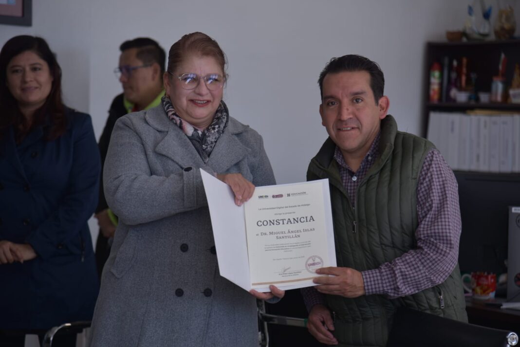 La Universidad Digital del Estado de Hidalgo (UNIDEH) entregó constancias a académicas y académicos por su colaboración en el Doctorado en Investigación e Intervención para la Innovación Educativa, próximo a integrarse a la oferta de posgrado de la institución.