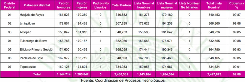 Finalmente, la funcionaria inform que, para la Jornada Electoral, las cifras definitivas de Padr n Electoral y la Lista Nominal de Electores en la entidad corresponden a 2,430,561 y 2,427,673, respectivamente, alcanzando un porcentaje de cobertura del 99.88 por ciento con corte al 11 de abril de 2025.
